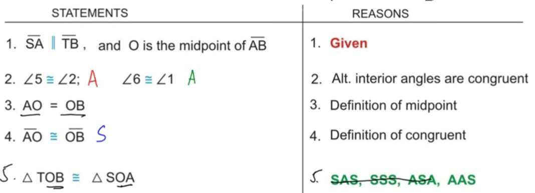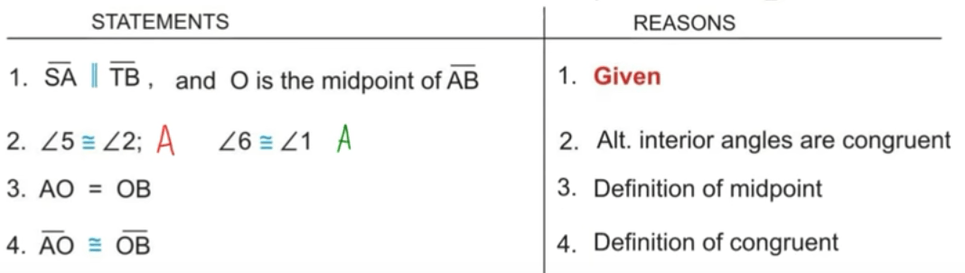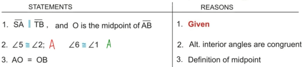 In this example below, you can see that Scarfi labeled the parallel lines AS and TB, congruent angles 5 and 2 and then 6 and 1, the midpoint at O and congruent sides AO and OB.