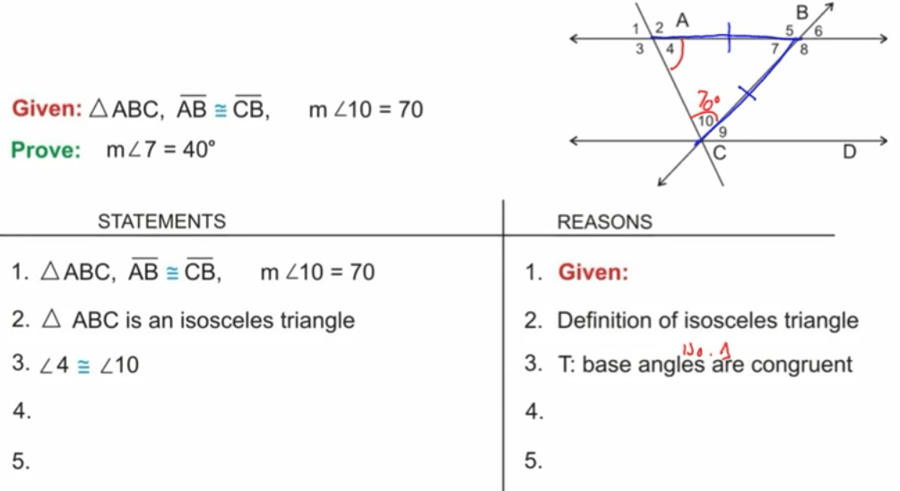 But, if the “given statement” helps your student figure out that the triangle is an isosceles triangle, your student can then use what they know about the definition of an isosceles triangle and its angles to figure out the third angle (See step 4 in the example below) and move to the next step.