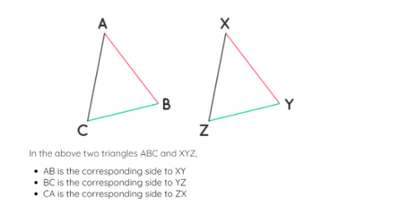 Corresponding sides or angles are a pair of matching sides or angles that are in the same spot in two different shapes.