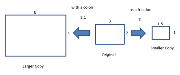 The original copy is in the middle. See how when you have a scale factor of 2:1, the copy gets larger. However, when the scale factor is ½, you can see the copy gets smaller. Take a look at the measurements on the sides of the rectangle. You can see the larger one’s dimensions are double and the smaller one’s dimensions are exactly half.