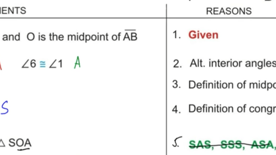 In the example below, the “given statement” shown in step 1 has SA (from triangle SOA) on the left and TB (from triangle TOB) on the right, but what is being proven has them reversed. If your teacher is very technical, they may want your student to use a symmetric property to switch them around to match what is being proven – shown in step 5.