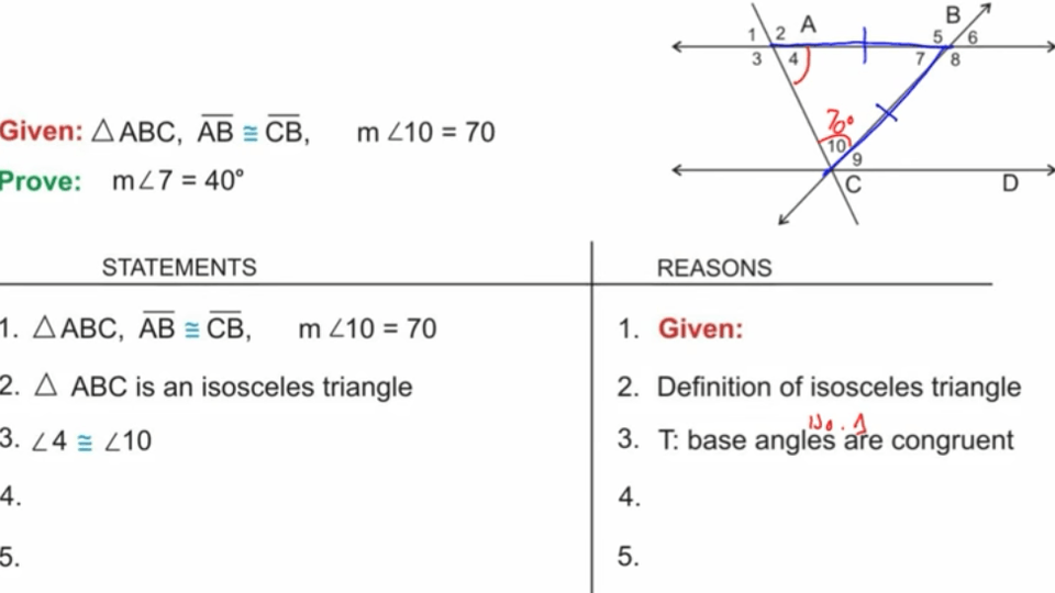 But, if the “given statement” helps your student figure out that the triangle is an isosceles triangle, your student can then use what they know about the definition of an isosceles triangle and its angles to figure out the third angle (See step 4 in the example below) and move to the next step.