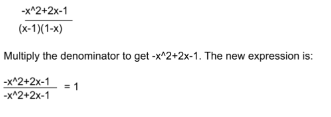 When adding rational expressions with unlike denominators, first find a common denominator. In the example below, the common denominator will be (x-1)(1-x).
