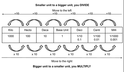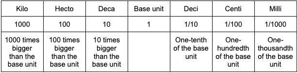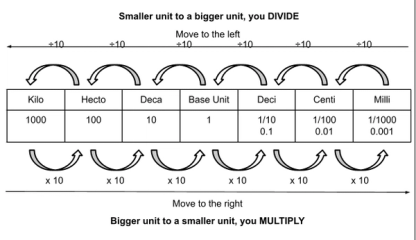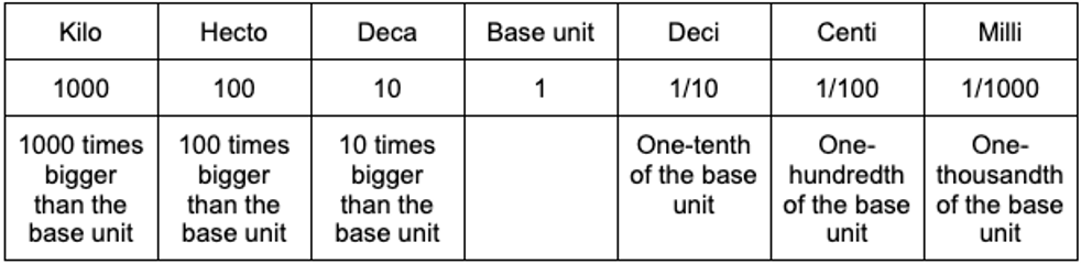 Identify the base unit being used: meter (length), gram (weight), or liter (capacity), then use the following concept to find the bigger or smaller unit: