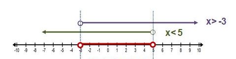 The solution to x > -3 is shown in the picture in purple. The graph to the inequality x < 5 is shown in green. You can see that the two inequalities intersect between -3 and 5 and do not include the numbers -3 and 5. Therefore we use an open circle at -3 and 5, then shade the area between. This is shown in the diagram as a red line. The red line is the only solution to the compound inequality x > -3 and x < 5.