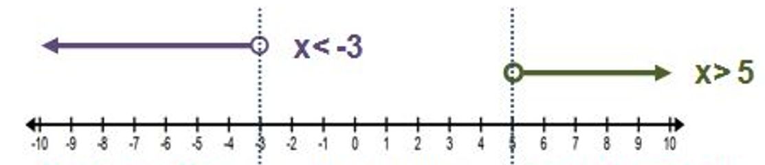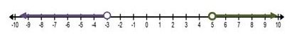 Solution: Since there is an “or” between, we will identify the solutions for each of these and graph the union. For x < -3, the solution includes all values less than -3, as identified in purple on the diagram. For x > 5, the solution includes all values greater than 5.