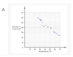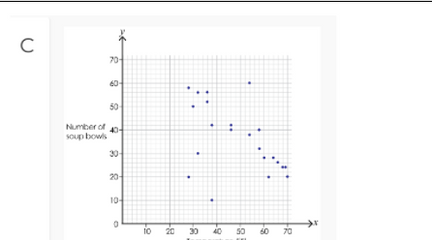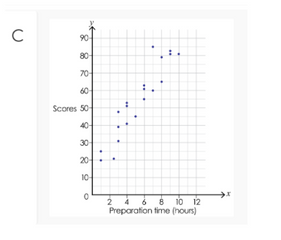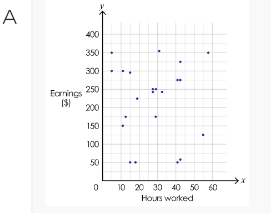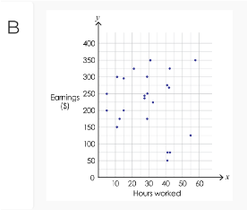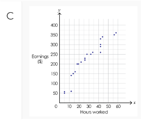 The answer to this problem is C. A and B are incorrect because they both show no correlation between the hours worked and the money earned. C is correct because it shows a positive correlation. As the x variable increases, the y variable tends to increase.