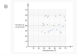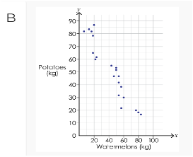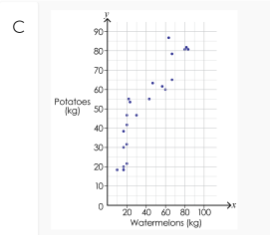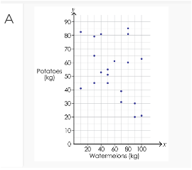 The answer to this problem is A. A shows no association between the watermelons and the potatoes. B and C are not the correct answers because B shows a negative correlation and C shows a positive correlation.