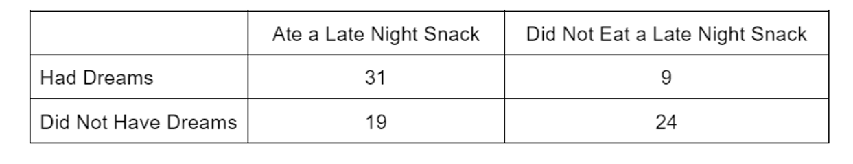 4. Researchers studied a group of people to see if late night snacking had any effect on dreaming. The results were as follows: