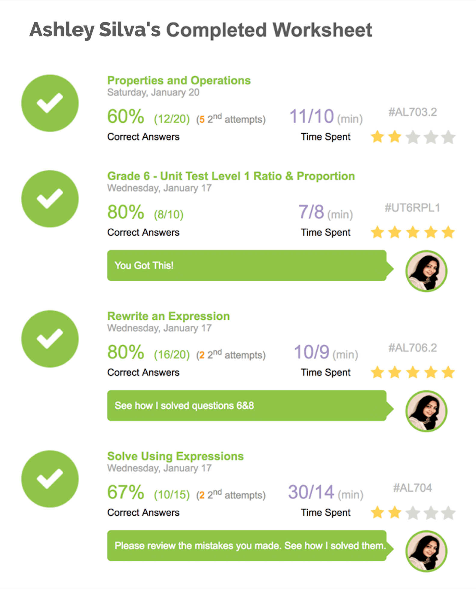 Track student progress in each math topic. View details about student’s worksheets, time spent, and accuracy.